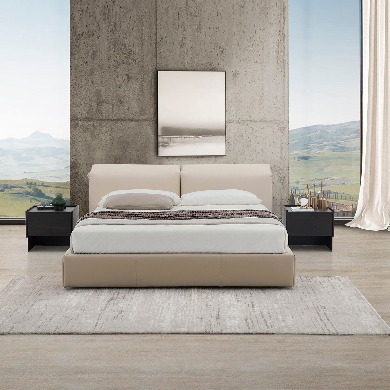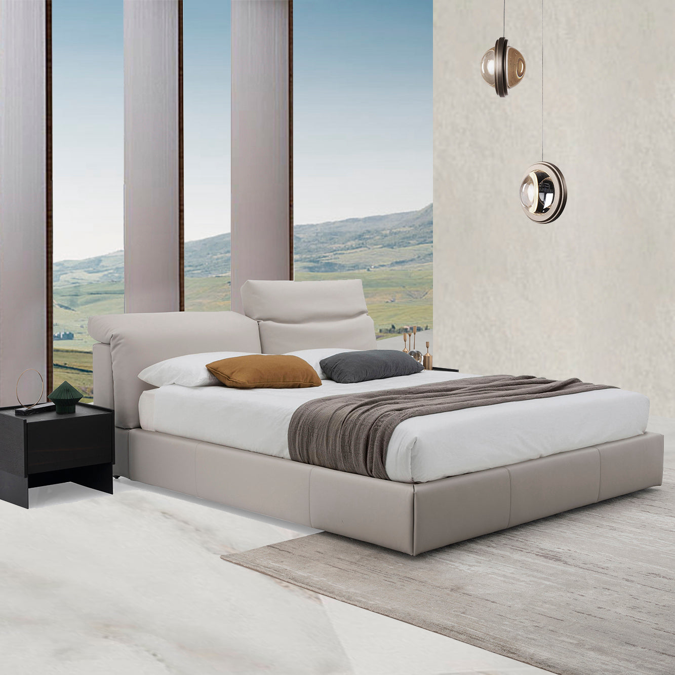 The Mecan bed's sleek, box-shaped design and floor-standing frame elevate any bedroom with a touch of contemporary elegance.