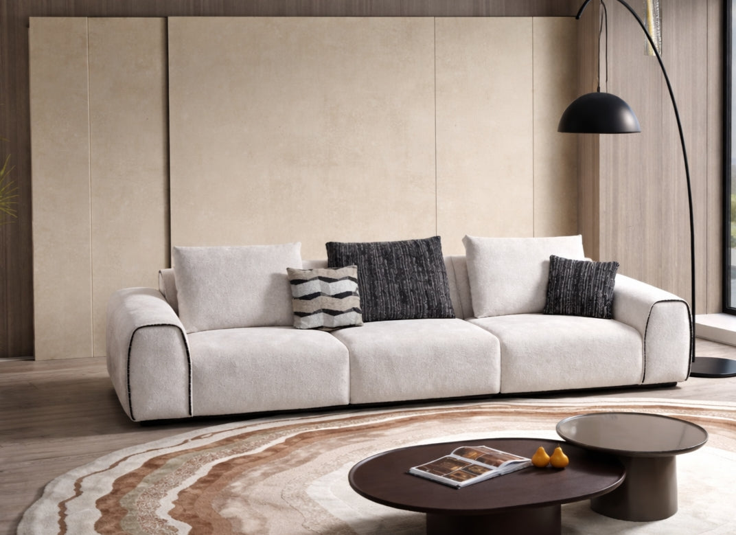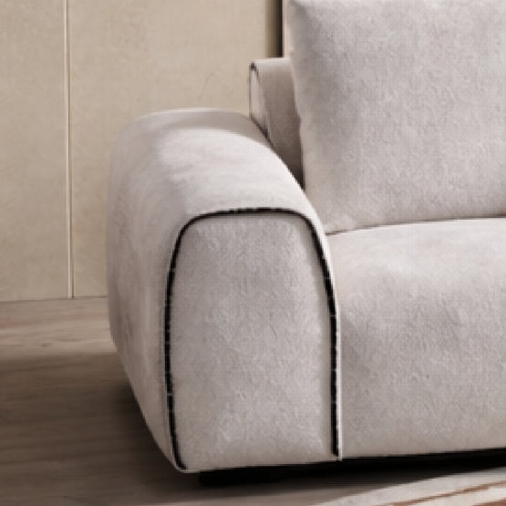 The Bijoux sofa exudes quiet sophistication with its softly rounded arms, meticulous contrast piping, and expansive, modular silhouette that invites effortless arrangement. Plush, generously proportioned cushions in a sumptuous neutral textile create an inviting, cloud-like embrace, while the clean lines and refined detailing lend an air of architectural poise. Bijoux transforms any living space into a sanctuary of understated luxury, where supreme comfort meets enduring, contemporary grace.