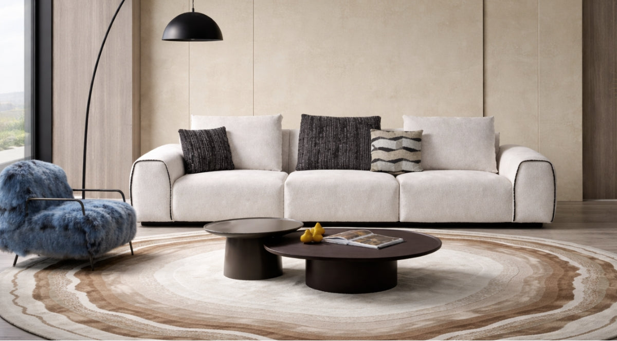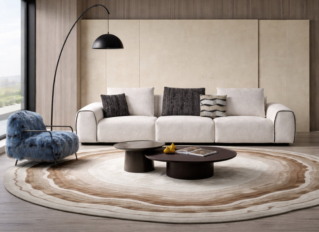The sofa features an elegant fabric with delicate wool curls, meticulously woven for a rich, dense texture. Its clean, natural colours and soft feel create a truly refined look, bringing a sense of timeless sophistication to your home.