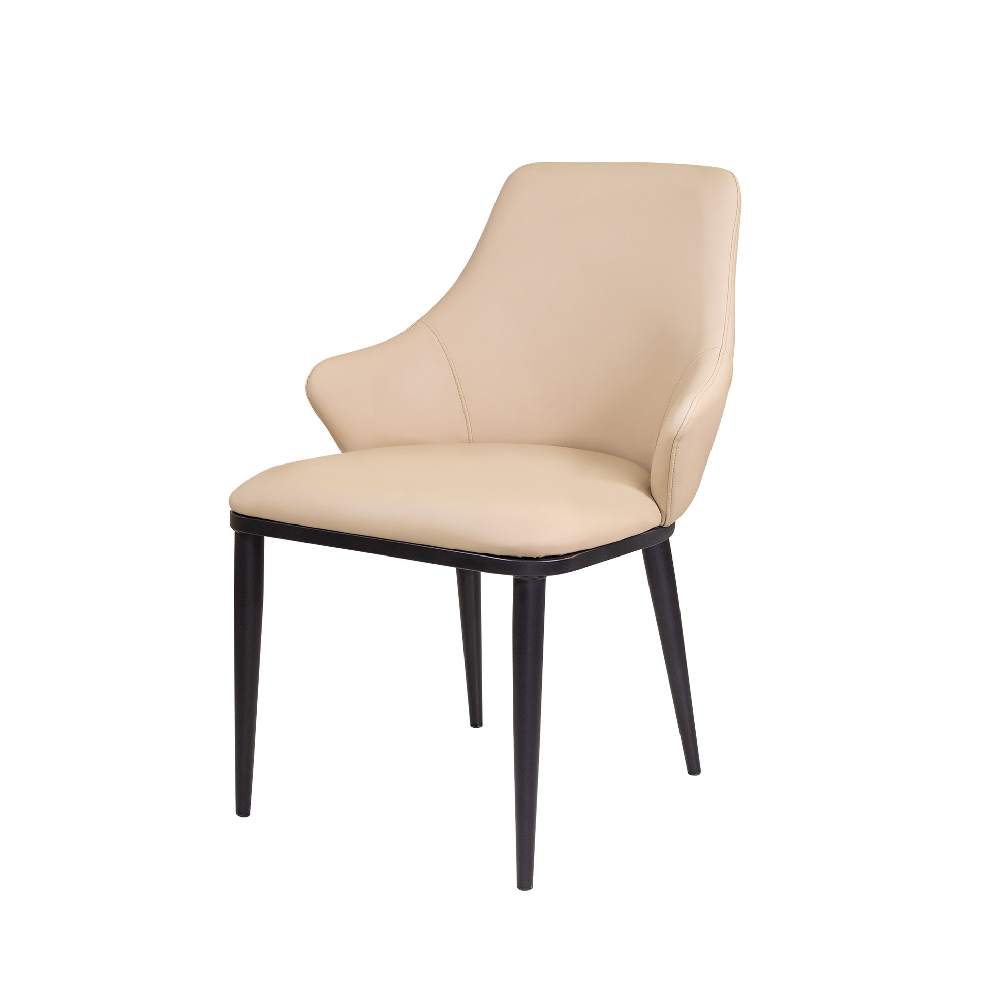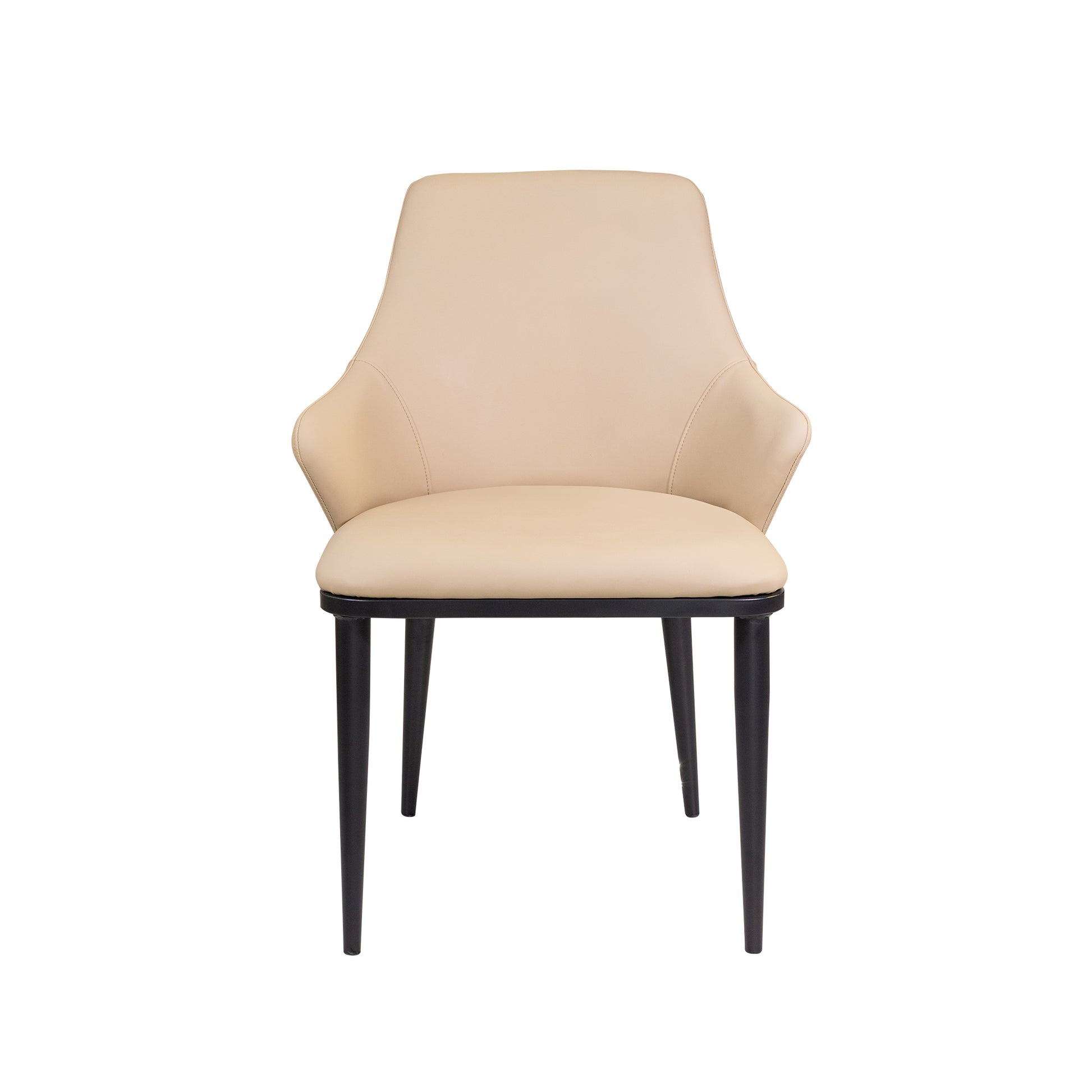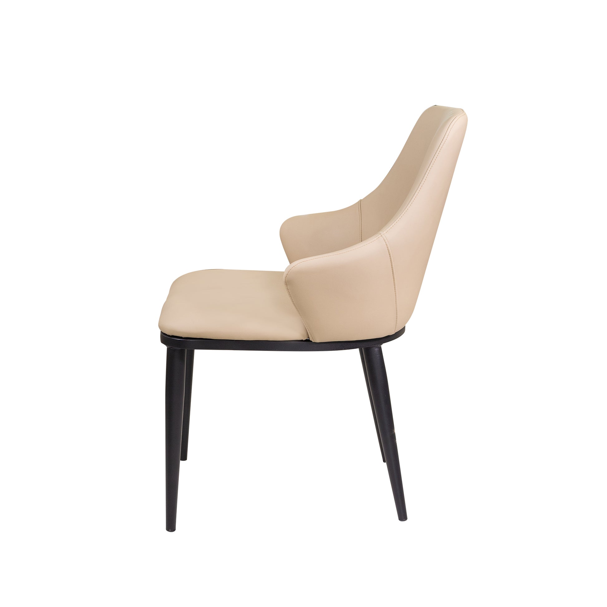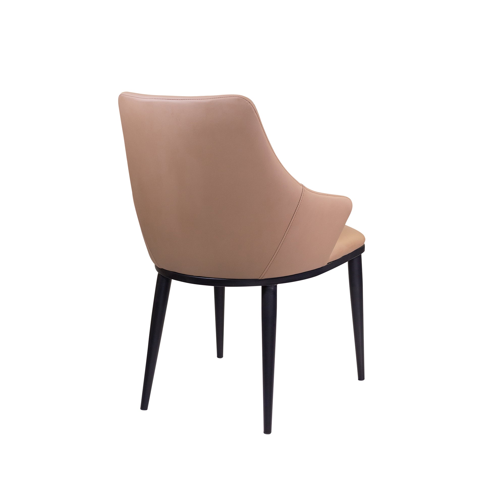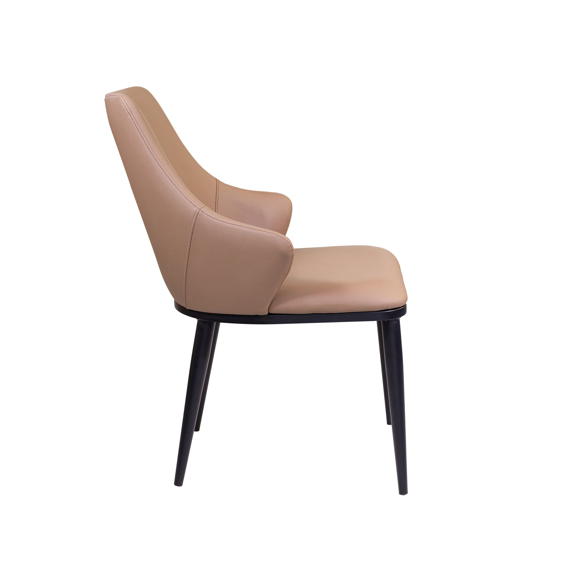 The Lumia dining chair features a sophisticated design with meticulously crafted leather upholstery and seamlessly integrated armrests.