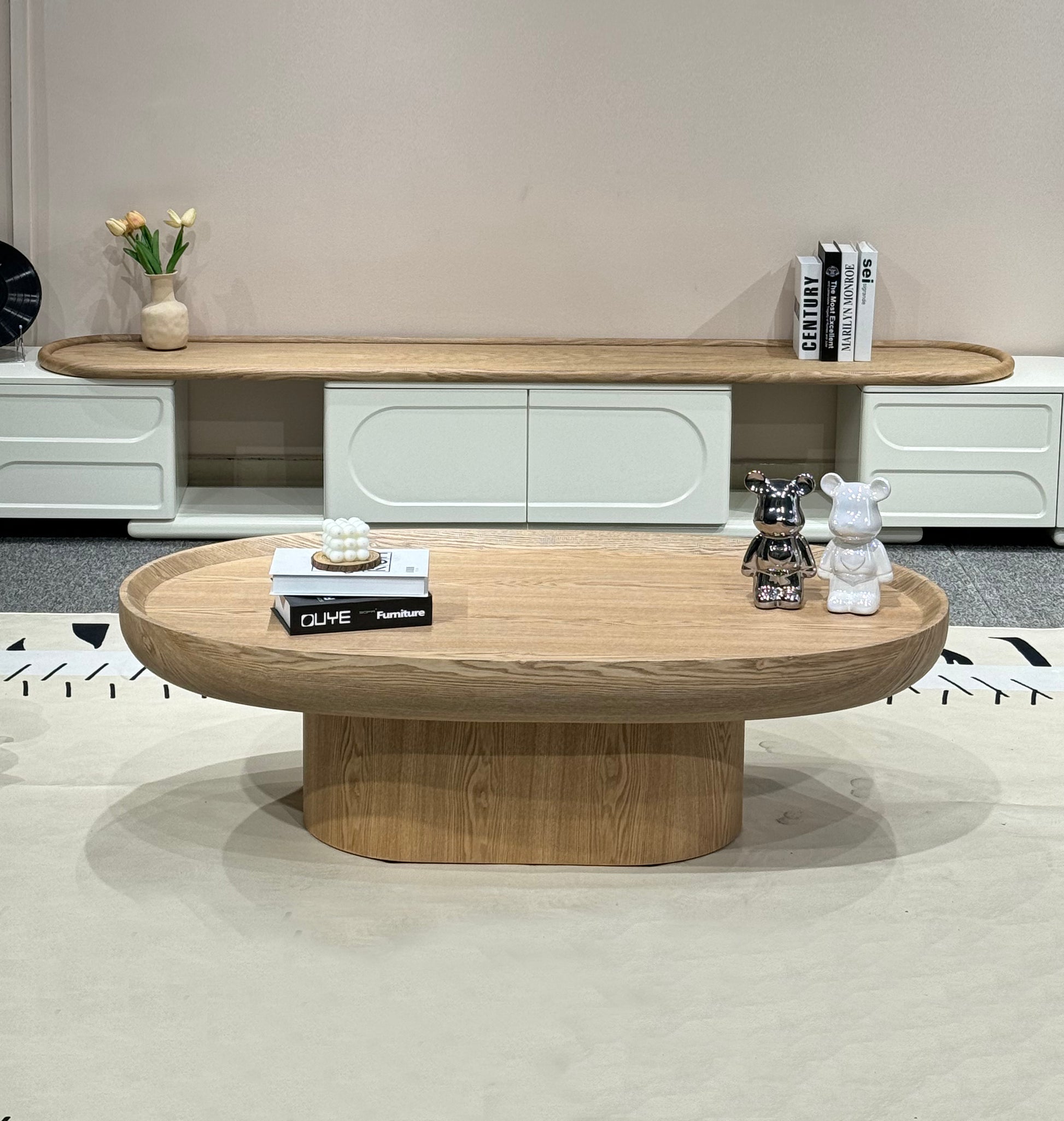 The Ceri coffee table is a minimalist masterpiece, featuring a graceful oval top that appears to float above a solid, sculpted ash wood base. Its balanced proportions and clean silhouette create a serene and captivating centerpiece, bringing a sense of calm to any contemporary living space.
