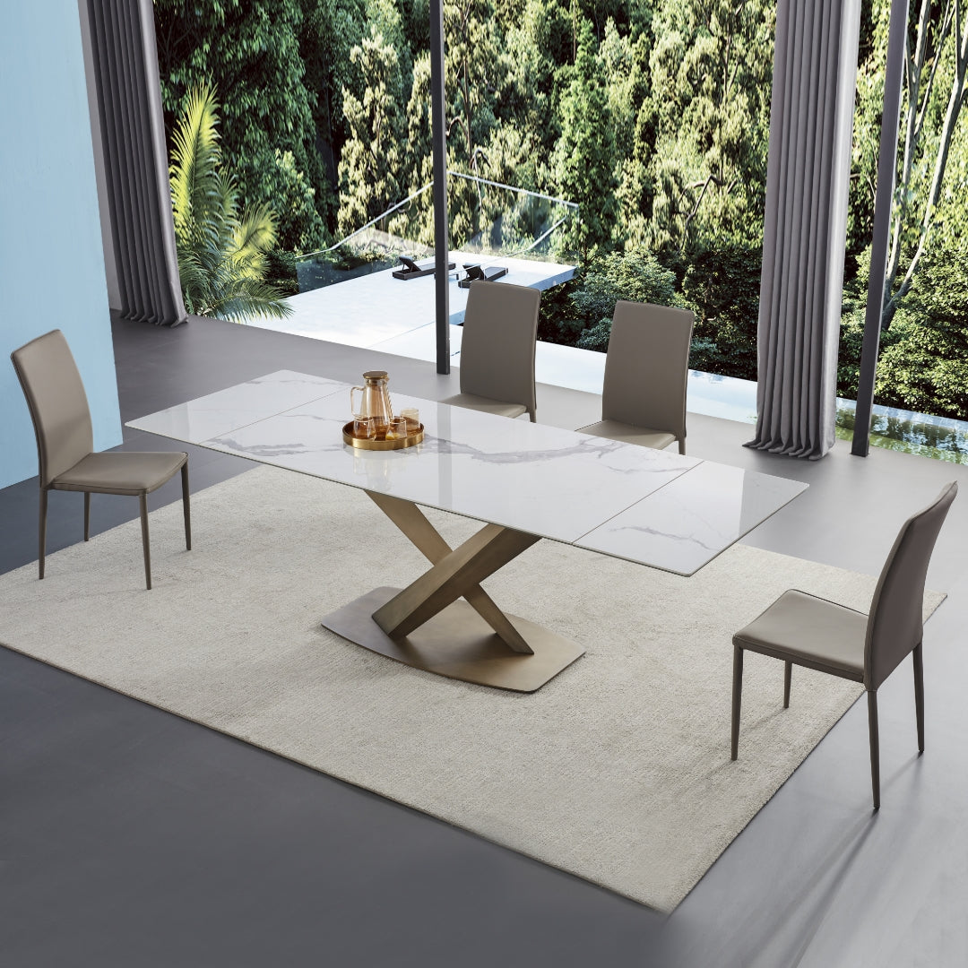 Denvori dining table features a sleek ceramic tabletop, a material known for its superior durability and scratch resistance.