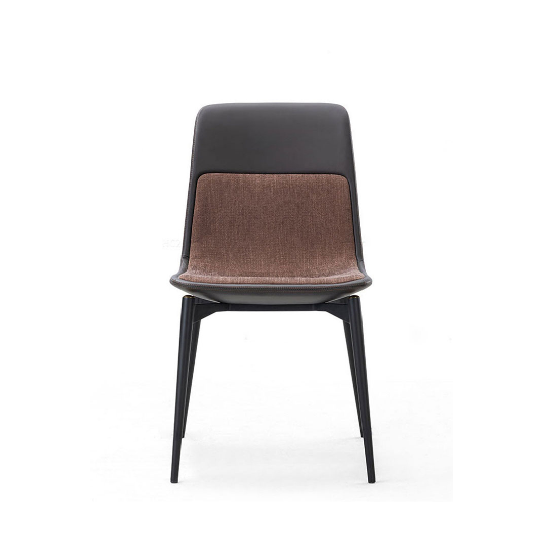 The combination of high-quality fabric and leather in a natural tone, matching the aesthetic.