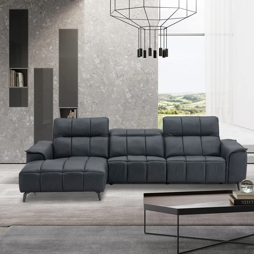 Backrest: High, tufted backrest with modern electric adjustment for headrest and footrest control.