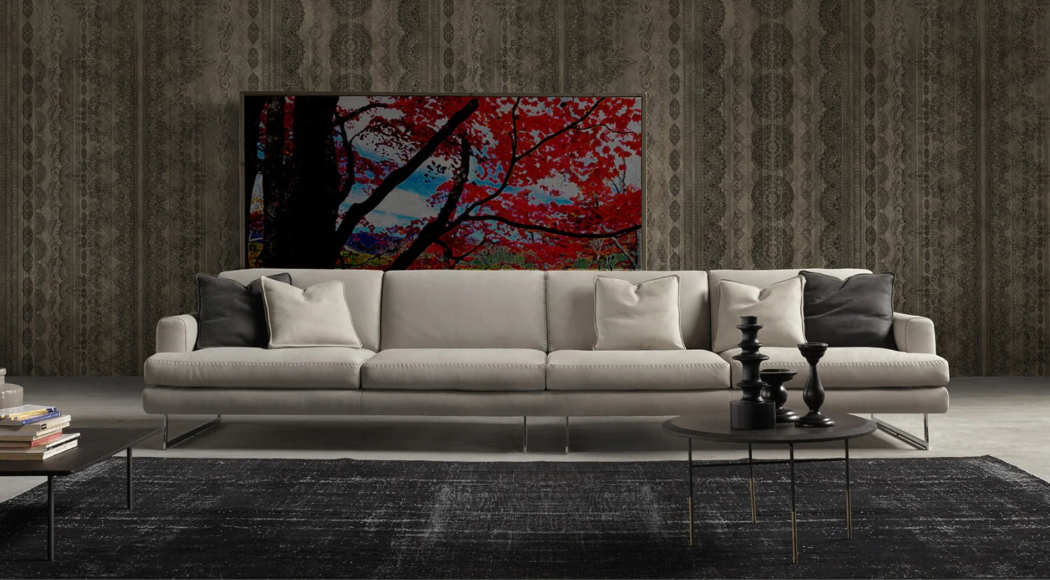 Rossini, a leader in luxurious Italian sofas, blends over thirty years of craftsmanship with contemporary design, intricate embroidery, and sustainable materials, offering meticulously crafted pieces that exemplify both aesthetic innovation and artisanal excellence. Experience the enduring sophistication of Rossini, exclusively distributed by COZY, featuring the exquisite Narciso sofa. The design is unique in various ways. The leather upholstery is characterised by contrasting, highly sophisticated topstitching that offers this model a surprising touch of elegance.