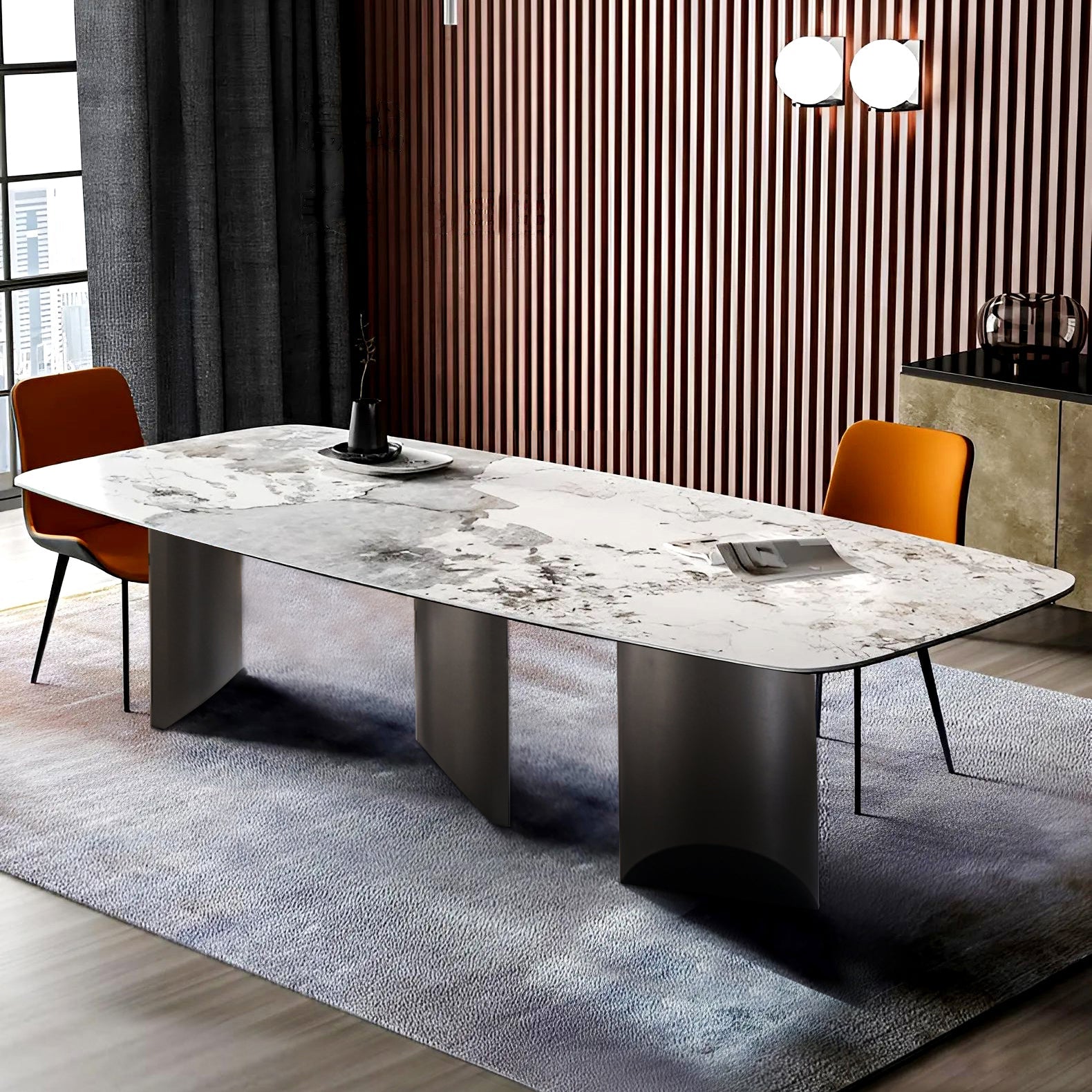 The minimalist base design, adorned with delicate curves, perfectly complements the elegant tabletop of the dining table. The choice of Ceramic or natural Marble ensures a harmonious and sophisticated aesthetic.